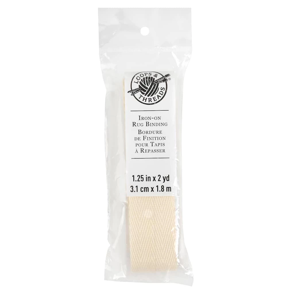 Iron-on rug binding is a fast and easy way to finish your latch hook, locker hook, rug yarn punch needle or traditional rug hooking projects. Simply use your home iron, as instructed on the back of the package, to iron on directly to the edges of your fabric.