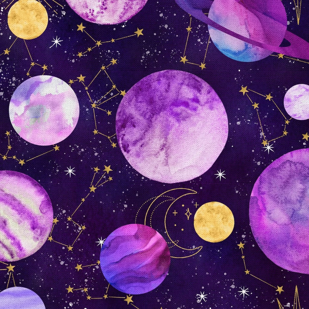 This fun purple space printed fabric is ideal for a variety of projects. Comprised of cotton, it’s versatile and a must-have for any crafter.
